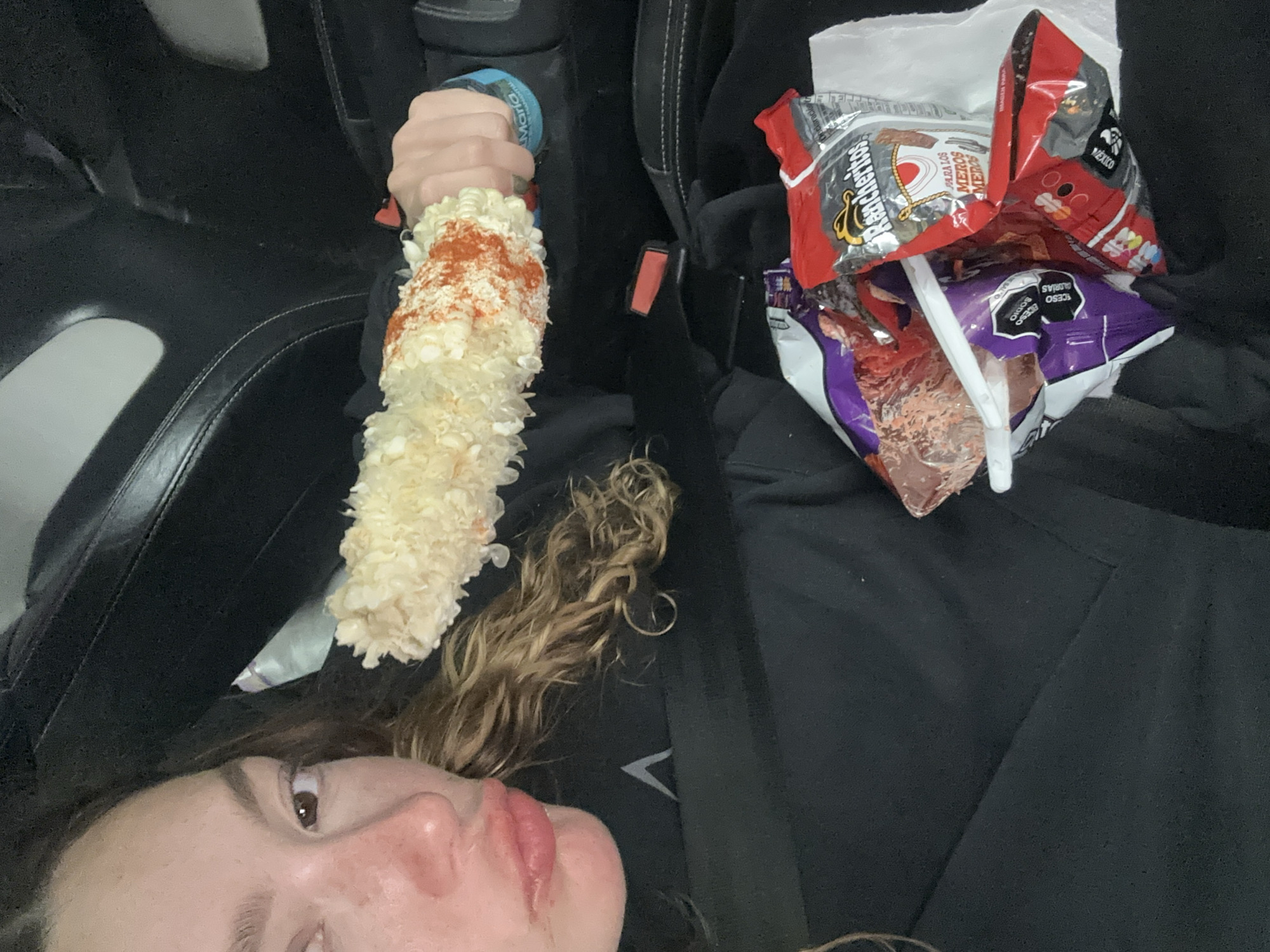 Here is a detailed description of the image: **People:** A woman is visible in the lower left corner of the image. She appears to be taking a selfie, as part of her face is in the frame. **Subjects:** An ear of elote (Mexican street corn) is prominently featured, held in a hand. Several bags of chips are visible next to the elote. **Objects:** The following objects are visible: * Elote on a stick, covered in toppings. * Several bags of chips. Brands visible include "Rancheritos" and a red bag with cartoon figures (potentially indicating a spicy snack). There is also a dark purple bag. * Seatbelt of a car. * A wristband on the hand holding the elote. * A white napkin. **Actions:** The woman appears to be taking a selfie with the elote and chips. **Interactions:** The focus is on the snacks being held. **Environment:** The setting appears to be inside a car. The background is dark, with glimpses of car seats and possibly a console. **Location:** No information is provided in the image that confirms the image was taken in the city of San Bernardino Tlaxcalancingo, Mexico. However, the packaging on the chips states, "Mexico".