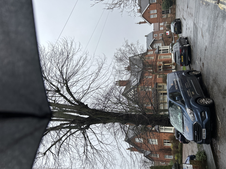 The image displays a street scene in York, United Kingdom, on an overcast day. A dark umbrella partially obscures the top portion of the frame. A large, bare deciduous tree occupies the left side of the image, its dark trunk rising from the foreground. A dark blue Ford Transit Custom van (license plate SK22 VAA) is parked on a wet asphalt street, angled slightly right. The van's side is branded with "PETER THOMPSON," "01904 466888," "KITCHENS, BATHROOMS, STAIRCASES, INTERIOR PROJECTS." Behind the van, a dark grey Audi A4 Avant (license plate YC18 OVB) is parked, followed by another dark sedan further down the street. In the background, a prominent multi-story red-brick building with white window frames, bay windows, and multiple chimneys is visible through the tree branches. This building exhibits white half-timbered gables and dark roofs. Other red-brick buildings, one featuring a small spire, line the street further into the distance. Overhead utility lines are faintly visible against the grey sky. The road surface appears damp. No people are present.