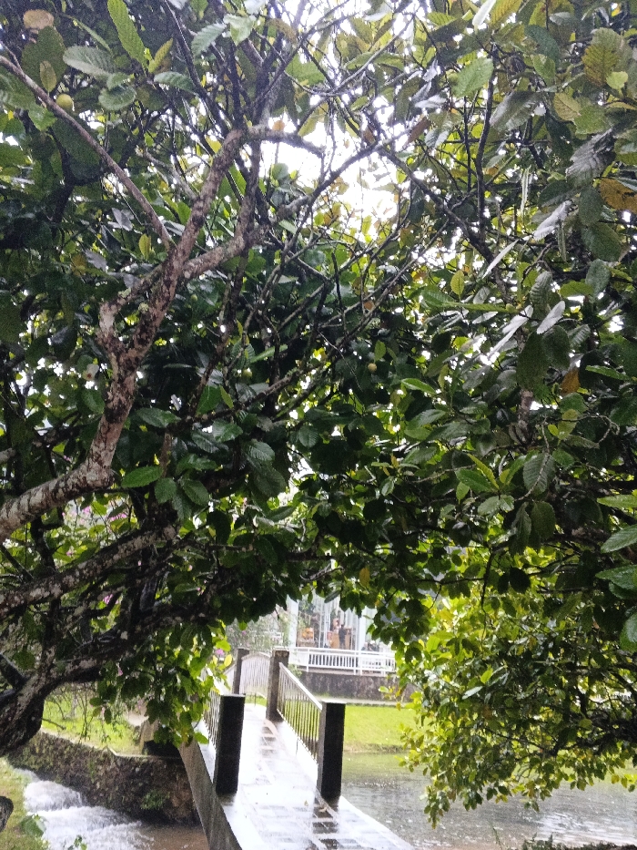 A vibrant green tree with abundant leaves dominates the scene. Its textured bark contrasts with the glossy leaves. A small concrete bridge spans a waterway, connecting to a building with glass windows. Rain falls, creating ripples in the water and wetting the bridge's surface. The overall impression is one of a lush, wet environment, possibly a park or garden.