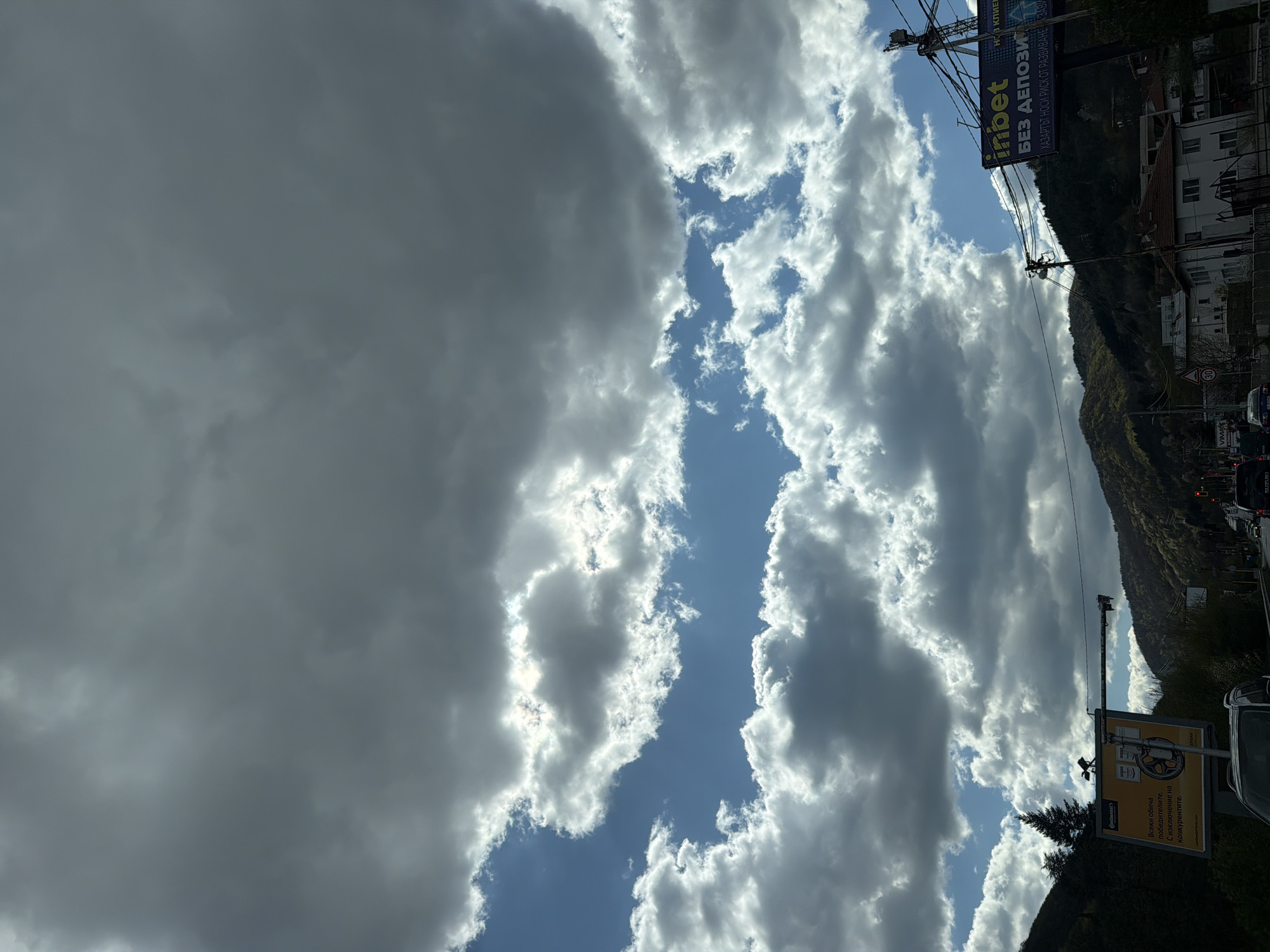 view of the sky with clouds, as well as buildings, trees, and a road. There is a banner advertising Inbet with the words "БЕЗ ДЕПОЗИТ," indicating that the location is likely in Bulgaria. Further down the road is a Continental advertisement. The presence of signs in Bulgarian suggests that the location is in Bulgaria, and the cityscape and surrounding hills point to the city of Sofia. The image captures a moment in the city with a mix of natural and urban elements.