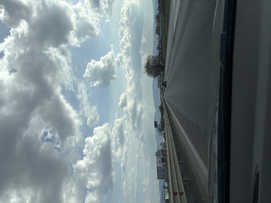 The image depicts a daytime scene from the interior of a vehicle, looking forward through the windshield onto a multi-lane asphalt highway on the eastern approach or exit of Sofia, Bulgaria, consistent with Tsarigradsko Shose, with the Vitosha Massif visible in the background. The immediate foreground shows the dark gray dashboard of the vehicle. The main subject is a three-lane highway, with vehicles traveling away from the camera. Several passenger cars are visible in motion, spaced moderately apart. To the left of the highway, a metal guardrail with red reflector markers runs parallel to the road. Beyond the guardrail, a dirt verge leads to a gray two-story commercial building with red accents, possibly a service station or auto garage. Further in the distance on the left, a blue billboard is visible, set against the hazy silhouette of mountains. The right side of the highway features an undeveloped stretch of ground with sparse, bare-branched trees. The sky above is largely covered by extensive, white and gray cumulus clouds, with significant patches of bright blue sky visible between them. No distinct individuals or specific interactions between people are observable. The environment is a peri-urban landscape transitioning into a more open area with mountainous terrain on the horizon.