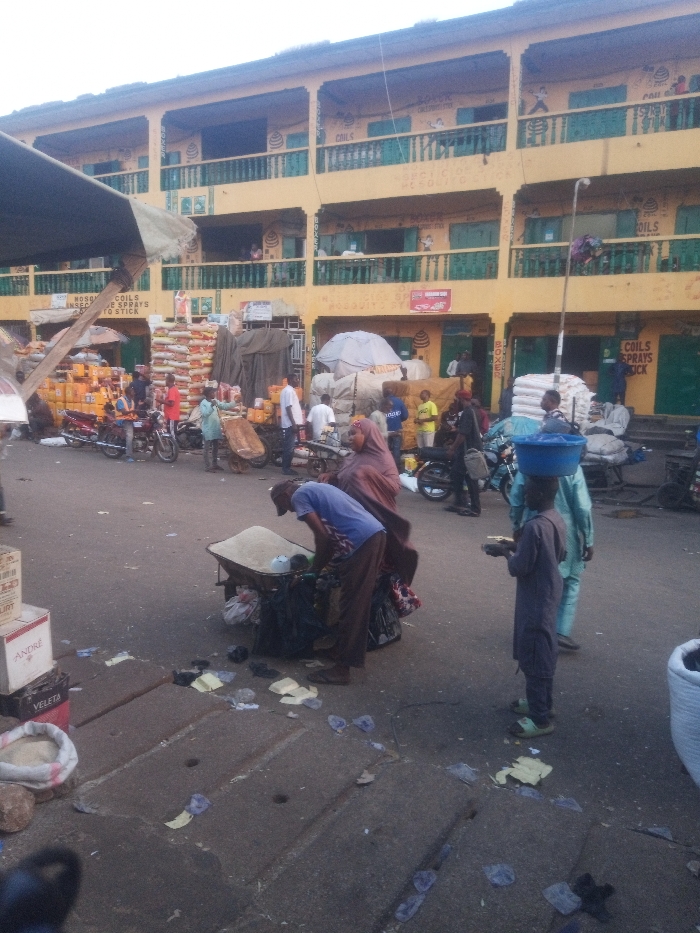 The image depicts a bustling outdoor market scene in the city of Maiburiji, Nigeria