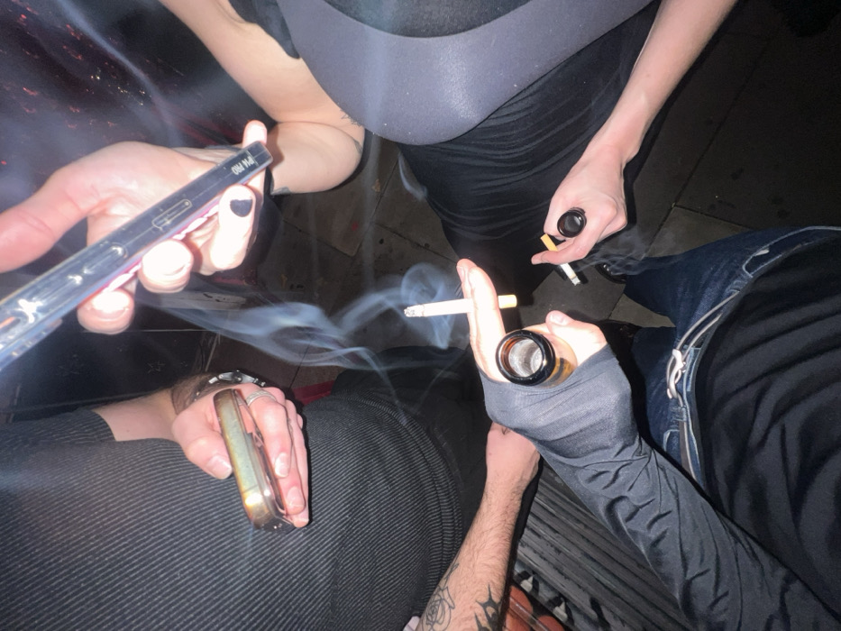 A high-angle shot shows four people, focusing on their hands. Two hands hold cigarettes, one also holding a beer bottle. Another hand holds a vape pen, and a fourth hand holds a metallic object, possibly a lighter. Smoke drifts across the frame. The people are wearing dark clothing; leggings, a ribbed top, jeans, and a long-sleeved top with fingerless gloves. One arm is tattooed. The scene is dimly lit, creating a casual, social atmosphere.
