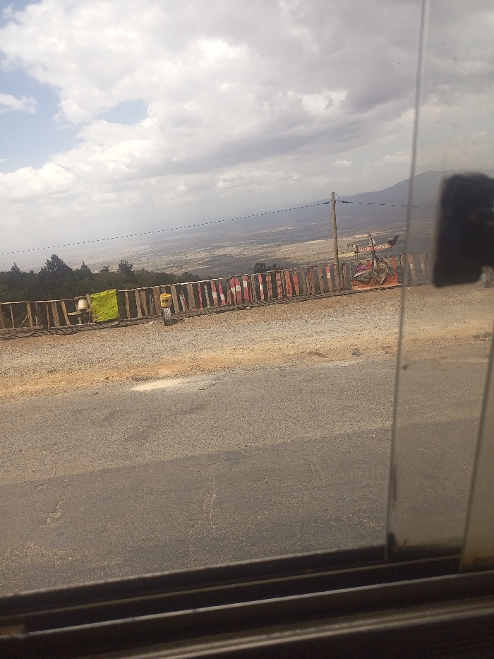 A view from a vehicle window shows a vast landscape under a cloudy sky. A fence with alternating red and white stripes runs along a dirt road, overlooking the terrain. Trees are visible in the midground, with mountains in the distance. A power pole stands near the fence. Part of the vehicle's window frame is visible in the foreground, including a blurred rectangular object attached to the glass.