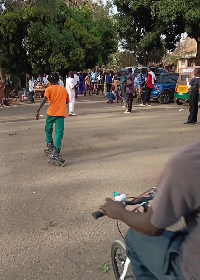 street scene with several people and vehicles. In the foreground, a young person on roller skates is attempting a trick, facing away from the camera. There's a small blue object on the ground nearby. Slightly behind the skater, a person on a bicycle rides into the frame from the left. A crowd of people is gathered in the background. The vehicles visible include a small three-wheeled vehicle and a blue car. There are trees lining the edge of the road. The scene appears to be outdoors in daylight.