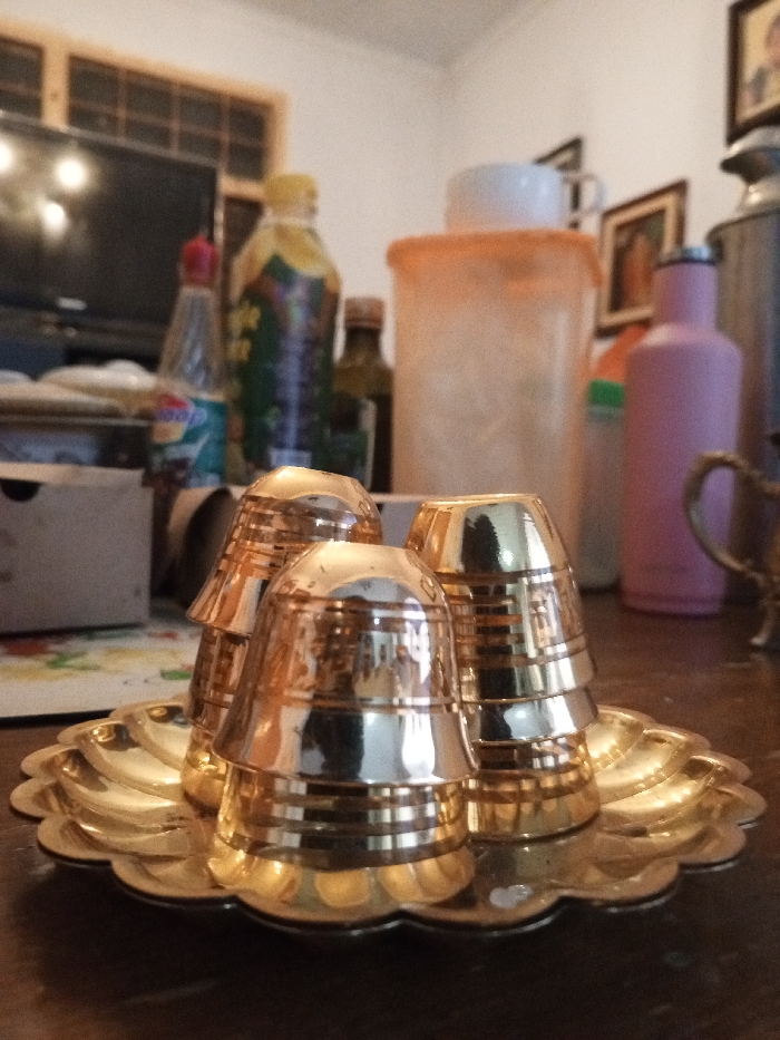 The image displays an indoor scene in Longmiang, Laos. In the foreground, three small, polished golden-colored cups, featuring horizontal ridges, are arranged on a scalloped golden-colored tray. Two of the cups are inverted and stacked, while the third is partially visible. These items rest on a dark, reflective surface, likely a table. The background is out of focus, revealing several household items. From left to right, a clear plastic bottle with a red cap and a multi-colored label, followed by a taller, opaque bottle with a yellow cap, are present. A section of a dark television screen and a window with a grid pattern are visible to the left. Centrally, a large, translucent orange storage container with a white lid is positioned, topped by a white ceramic mug. To the right, an opaque pink bottle stands next to a smaller, light green bottle. A portion of a decorative metallic object with a handle is visible on the far right. The background wall is light-colored, displaying at least two framed pictures. No individuals are depicted in the scene.