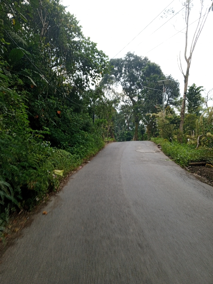 This image depicts a paved road extending into the distance under an overcast sky, reportedly located in Kheda, India. The road surface is dark grey, appears to be asphalt, and lacks lane markings, showing a slight upward incline. Dense green vegetation, consisting of various trees, shrubs, and undergrowth, lines both sides of the road. The left side features a thick, continuous wall of foliage, with a small piece of light-colored litter visible at its base. On the right, the vegetation is also dense, with several trees of varying sizes, including a prominent tall, bare-branched tree in the mid-ground. A utility pole with a solar panel and a light fixture is partially visible on the right side, positioned behind some trees. Thin, dark utility wires traverse the upper portion of the frame against the uniformly light grey sky. No individuals, vehicles, or animals are present. The lighting is diffused, indicating an overcast condition.
