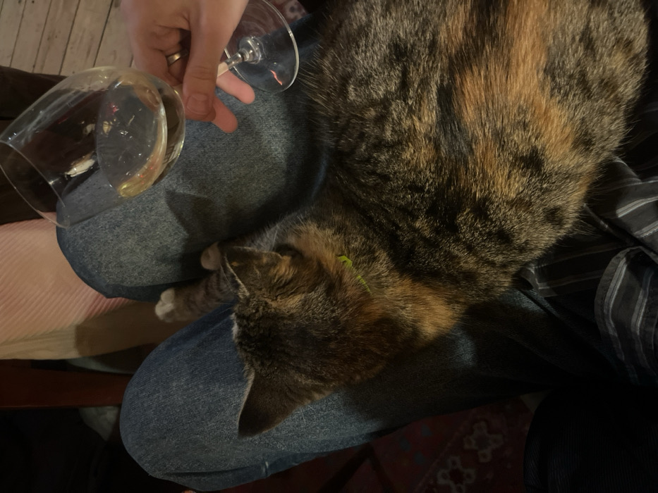 A tortoiseshell cat rests on the lap of a person wearing jeans. The person is holding a glass of wine with a gold wedding band visible on their ring finger. The cat's head is angled towards the person's knee. A striped shirt is visible underneath the cat. The background features a partially visible red rug and wooden flooring.