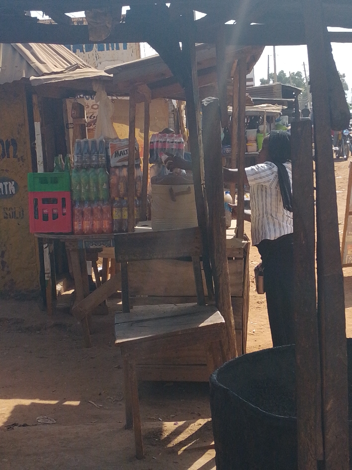 The image displays an outdoor refreshment stall or shop. The specific location within Akwanga, Nigeria, is not discernible from the visual information provided. The scene is illuminated by strong sunlight, casting distinct shadows. In the foreground, three substantial vertical wooden posts frame the view. To the left, a faded yellow-painted wall features partial black lettering, including "MTK." In the midground, a wooden table serves as a display area. Stacked upon it are multiple cases and individual bottles of beverages. These include red and green plastic crates holding bottles, as well as multiple stacks of clear and dark bottled drinks, including "MALT" (Maltina) branded items. Behind these beverages, a light-colored insulated cooler or container with a handle is positioned on the table. One individual, a person with dark hair styled in dreadlocks or braids, is visible standing to the right of the table. They are wearing a vertical white and dark-striped long-sleeved shirt and dark trousers. A dark piece of fabric or scarf is draped over their left shoulder. The person's right hand is extended towards the cooler, holding a small white bottle, possibly for pouring or dispensing. To the immediate right foreground, a rustic wooden chair with its back angled towards the viewer is present. In the extreme bottom right, a dark, heavy-duty bucket or container is partially visible. The ground surface consists of packed dirt or sand. Various small items and debris are scattered on the ground. The background shows blurred additional structures, suggesting a busy street or market area.