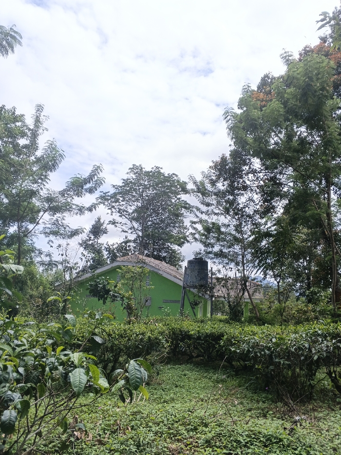 A green building nestled amongst lush foliage under a cloudy sky. The building has a light-colored roof and a water tank on one side. Trees frame the scene, with dense greenery in the foreground, obscuring parts of the building. The landscape is overgrown and natural.