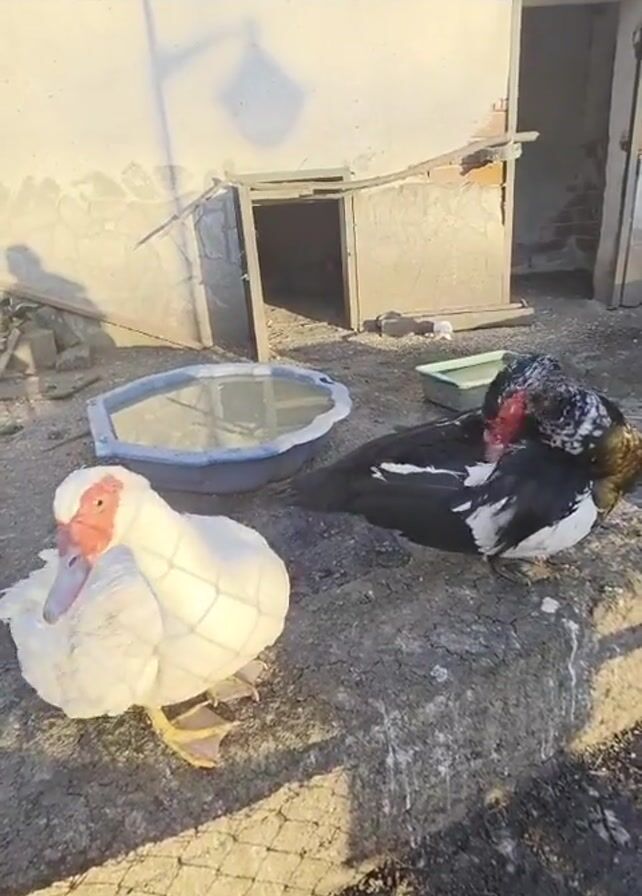 two Muscovy ducks in a yard with a building as backdrop. The duck on the left is pure white with a distinctive red face. The duck on the right is lying down and is black and white with a similar red face. Between them is a blue tub filled with water. The ground they are on is a concrete slab covered with a shadow from a fence. A hand reaches out to touch the white duck.
