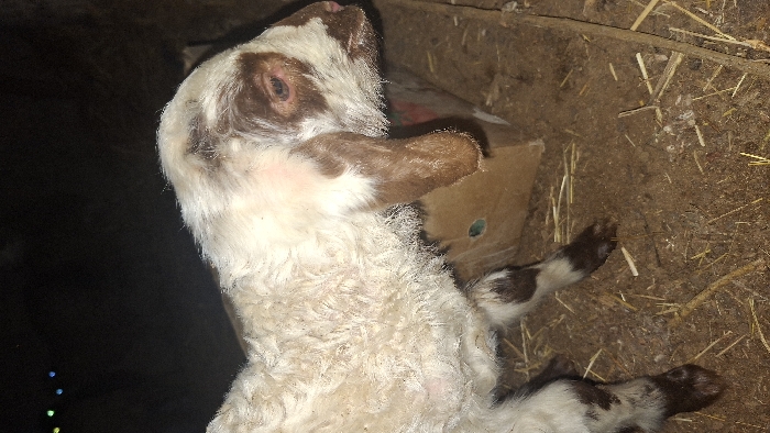 The image displays a single lamb standing in an animal enclosure within the city of Khujayli, Uzbekistan. The lamb features a white, curly fleece with prominent brown patches on its face, around its eyes, and on its pendulous right ear, which is visible. Additional brown markings are present on its neck and front legs, which terminate in dark hooves. The lamb's eyes appear dark with slight redness around the edges, and its snout shows residue, consistent with moisture or feed. It stands facing right in profile, with its head slightly angled towards the viewer. The ground consists of dark brown soil mixed with straw and other organic debris. In the background, behind the lamb, is a light brown cardboard box, possibly serving as a feed container or structural element, with a green marking visible on its side. The scene is dimly lit, suggesting a night-time or indoor setting, with several small, multi-colored lights (green, yellow, blue) faintly discernible in the upper left background. No people are visible.