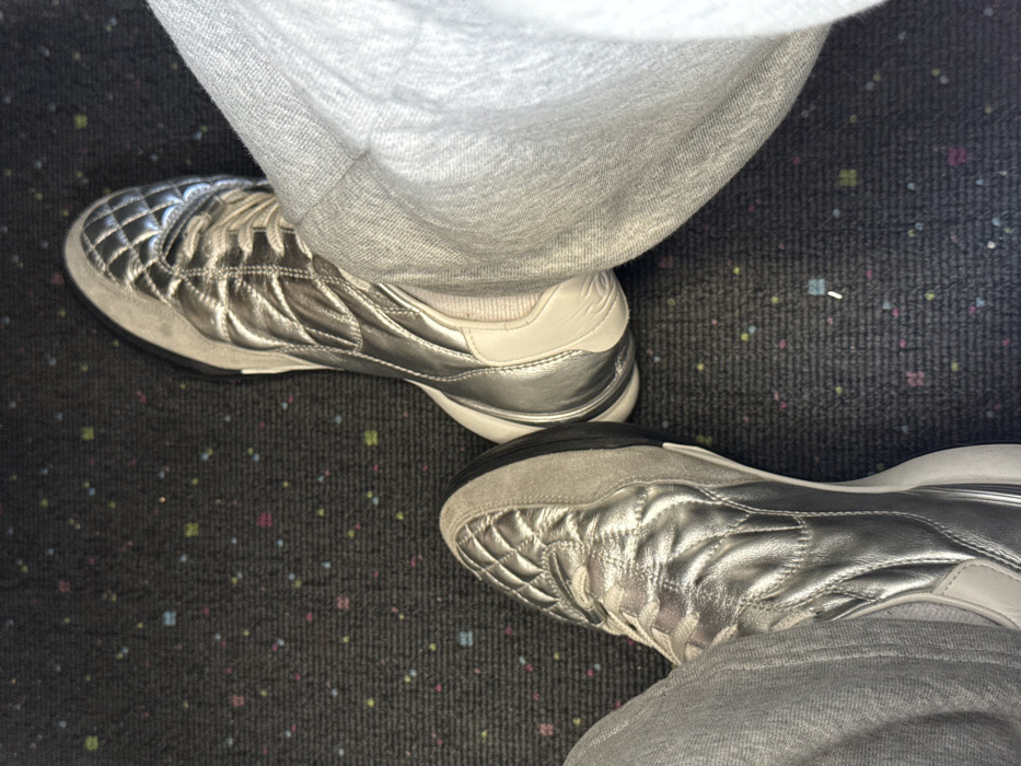 An overhead photograph captures the lower extremities of an individual, likely seated, within an interior environment. The subject's feet are clad in silver athletic shoes featuring quilted metallic uppers, light gray suede overlays, white midsoles, and black outsoles. Light gray sweatpants are worn, partially obscuring the ankles. The footwear rests on a dark gray carpet patterned with small, uniformly distributed multi-colored squares in pink, blue, green, and yellow. Visual evidence in the image does not permit determination of a specific location within Tijuana, Mexico.