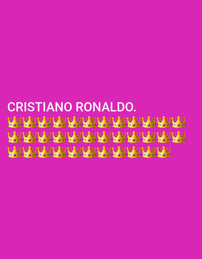 A pink background features the white text "CRISTIANO RONALDO." Below, there are three rows of gold crown emojis, each with purple jewels. The crowns symbolize royalty or praise for the named individual. The background is a vibrant, solid color, providing strong contrast for the text and emojis.