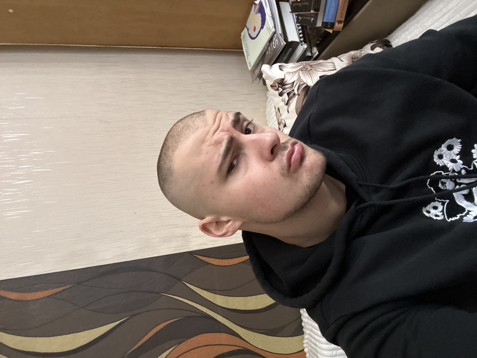 The image displays a young adult male in an indoor setting. The specific location within the city of Tervel, Bulgaria, is not discernible from the visual information presented. The male subject, positioned centrally, has a light complexion, a buzz cut hairstyle, and light facial stubble. He is looking directly at the viewer with a slightly downturned mouth and furrowed brow. He is wearing a black hooded sweatshirt featuring white embroidered graphics of stylized mushrooms and daisies on the chest. To the subject's left, a wall is covered with wallpaper exhibiting a wavy, abstract pattern in shades of brown, beige, and orange. To his right, a plain, light-colored wall or textured wallpaper is visible, alongside a vertical segment of light brown material, possibly a door frame or furniture. A stack of books and papers is present on a surface in the mid-ground to the right, next to a cushion with a floral pattern. The subject appears to be seated or leaning on a surface covered by a white, textured textile.
