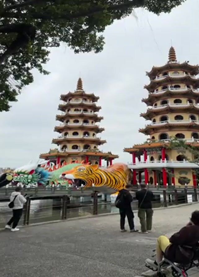 paved walkway in front of two pagodas on an overcast day. The pagodas are multi-tiered and light brown, with detailed roof designs. In front of the pagodas, connected by a bridge, are large, colorful dragon and tiger statues, which tourists are taking pictures of. Several people are on the walkway, some taking pictures and others simply observing the scene. The pagodas and statues are situated in the middle of a body of water, which is calm. The overall atmosphere is tranquil, despite the presence of tourists. A tree with lush green foliage frames the left side of the scene.