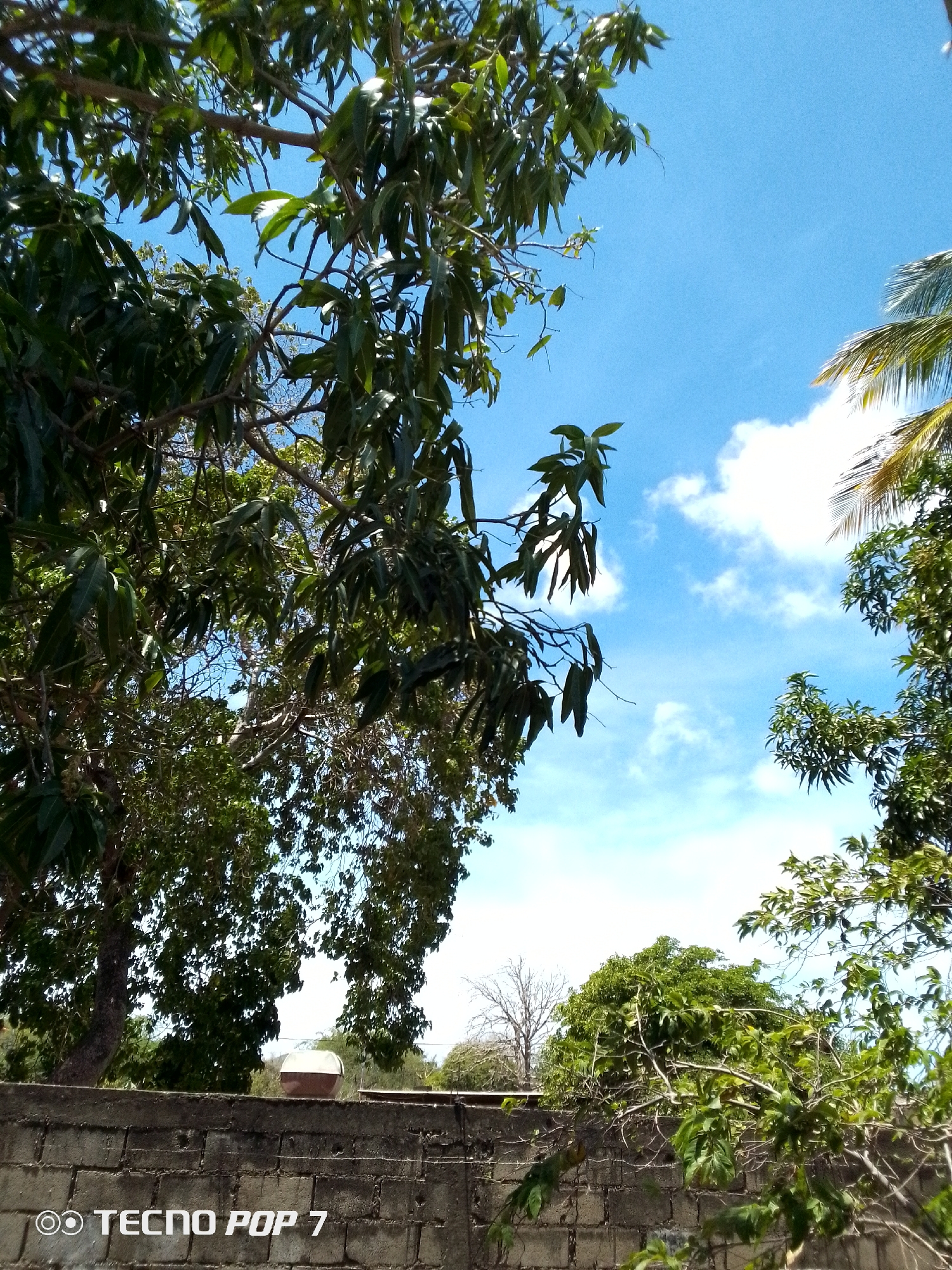 The image depicts an outdoor scene in Altagracia, Venezuela, captured from a low vantage point looking upwards towards a bright blue sky with scattered white cumulus clouds. The foreground features a weathered concrete block wall, grey in color, running horizontally across the lower quarter of the frame. Above and behind the wall, dense green foliage from various trees dominates the midground and upper left. A prominent tree with dark green leaves, consistent with a mango tree, occupies the upper left and central portions, its branches partially obscuring the sky. A palm frond is visible in the upper right. A leafless deciduous tree stands in the distant background, center-left, behind other green foliage. A light-colored, curved object, possibly a water tank section or roof vent, is partially visible above the wall in the central background. No individuals or active subjects are present. The environment suggests daytime under clear to partly cloudy conditions. A 'TECNO POP 7' camera watermark is present in the lower-left corner.