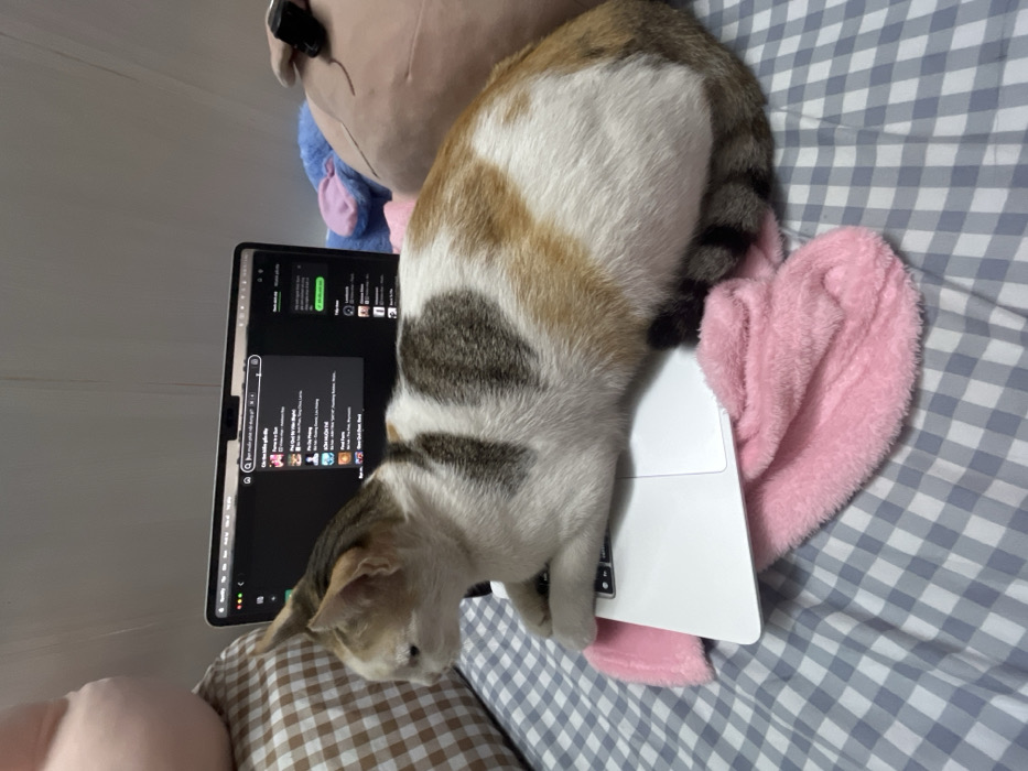 A domestic calico cat, predominantly white with distinct dark tabby and orange patches, is observed resting. Its front paws are placed on the keyboard area of an open silver laptop. The laptop is situated on a folded pink, fluffy textile item, likely a pair of slippers, which itself lies on a bed covered by a blue and white checkered sheet. The laptop screen displays the Spotify application interface, featuring a dark theme and text primarily in Vietnamese, including a search bar query. To the left of the cat, a brown and white checkered pillow is visible. In the background to the right, light brown and blue plush objects are present. This indoor domestic scene is located in Thủ Đức, Vietnam.