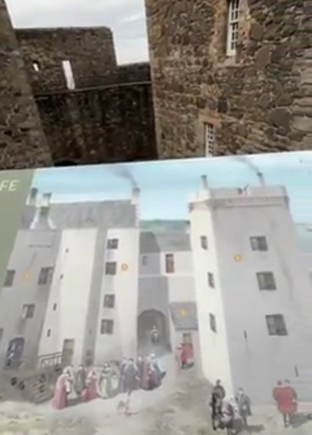 person holding a sign that depicts a historical rendering of Blackness Castle in Scotland. The rendering shows people in historical clothing in the castle courtyard. The camera moves from the sign to the castle itself, showing the stone walls and towers. The sky is overcast.