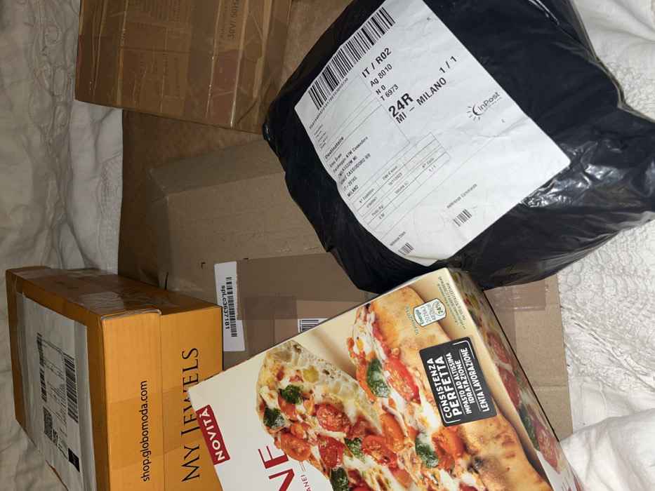 A collection of packages sits on a bed. A black InPost package, labeled "IT / R02," has a visible address in Milan. An orange "MY JEWELS" box from shop.globomoda.com is nearby. A pizza box with the word "NOVITA" and Italian text about its "PERFETTA CONSISTENZA" is also present. A brown cardboard box with "spLc3637181" on its label is near the pizza box. Another partially visible box has a label with "30V/50HZ" printed.