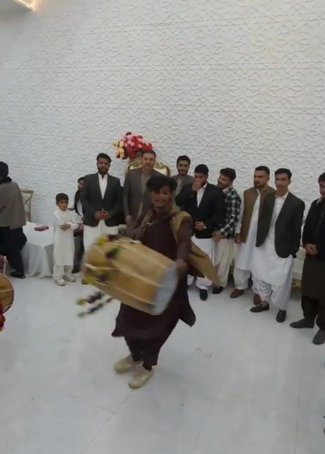 A man performs a folk dance with a drum in a large, brightly lit room. He wears a brown shalwar kameez with a tan waistcoat and gold shoes. He spins and moves energetically, holding a drum that he occasionally plays. Several men and a young boy stand along the wall, watching him. Most are dressed in traditional Pakistani or Afghan clothing, including shalwar kameez and vests or suit jackets. The room has a white tiled floor and an embossed white wall. Some floral arrangements and ornate chairs are visible in the background. The camera is held by someone standing close to the dancer.