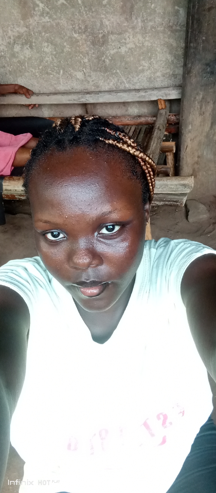 A dark-skinned woman with braided hair takes a close-up selfie. Her face is slightly shiny and framed by light-colored braids. She wears a white T-shirt, partially obscuring the lower portion of the frame. The background includes a weathered wall and a wooden structure, possibly a bed or bench, with a person lying on it. An "Infinix Hot Play" watermark is visible in the lower left corner. The overall lighting suggests an indoor or shaded outdoor setting.
