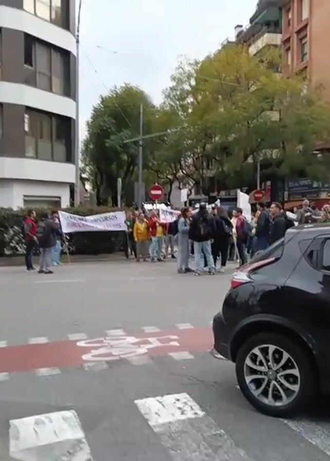 A street-level video shows a group of people gathered in a city street. Many are standing in and near a crosswalk at an intersection. Some people are holding banners, while others are holding signs. They are standing on both sides of the street, blocking traffic, while others are walking around. A black car is stopped at the crosswalk. The buildings in the background are a mix of residential and commercial, with shops and apartments visible. Traffic lights and other street signs are in view. The weather appears overcast. The sound of a horn can be heard. There are police officers present.