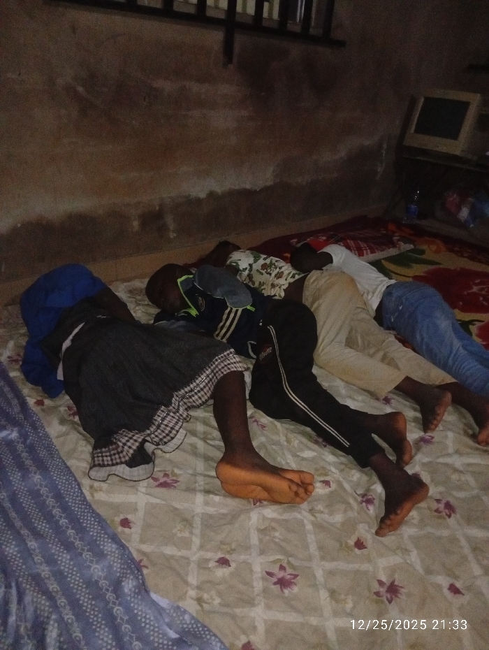 Four people are lying head to toe on a bed with floral patterned sheets. The first figure wears a blue head covering and a gray skirt. The second is dressed in a black and blue jacket with black pants with white stripes. The third person has a white patterned shirt and tan pants. The last individual is wearing a white t-shirt and blue jeans. In the background, there is a desk with a computer monitor. A window is visible at the top. The wall appears to be stained.