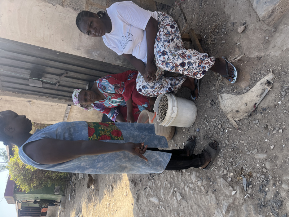 The image depicts an outdoor scene in Dzhidu, Nigeria, featuring three adult females and a partial view of a fourth individual. In the foreground, a dark-skinned female stands on the left, oriented rightward, wearing a light blue-grey sleeveless tunic with a floral pattern panel at the waist, black trousers, and dark slide sandals. Her right hand is lowered, with the index finger extended downwards. She appears to be interacting with two dark-skinned females seated on the ground to her right. The central seated female wears a multi-colored patterned garment in red, blue, and white, along with a light-colored floral headscarf. She is positioned on a low surface, looking towards the standing female. To her right, the third female is seated on a low wooden stool, wearing a white t-shirt with the text "I AM FREUND (ICH)" and white trousers patterned with blue, red, and brown motifs, along with black flip-flops. Her hands are clasped in her lap, and her gaze is also directed towards the standing female. Between the standing and seated individuals, two white plastic buckets filled with small, light brown, uniform-sized items, possibly nuts or seeds, are visible on the unpaved, gravelly ground. A woven basket is partially visible behind the buckets. In the immediate foreground, a torn, light-colored piece of material, possibly plastic or fabric, rests on the ground. The background features a light-colored wall with a dark wooden door or gate behind the seated women. Further back on the left, a green structure and some foliage are visible, along with a partial view of another individual, possibly a child, standing near the green structure. A small fowl, likely a chicken, walks on the dirt path to the left of the standing female. The scene is illuminated by direct sunlight, casting visible shadows.