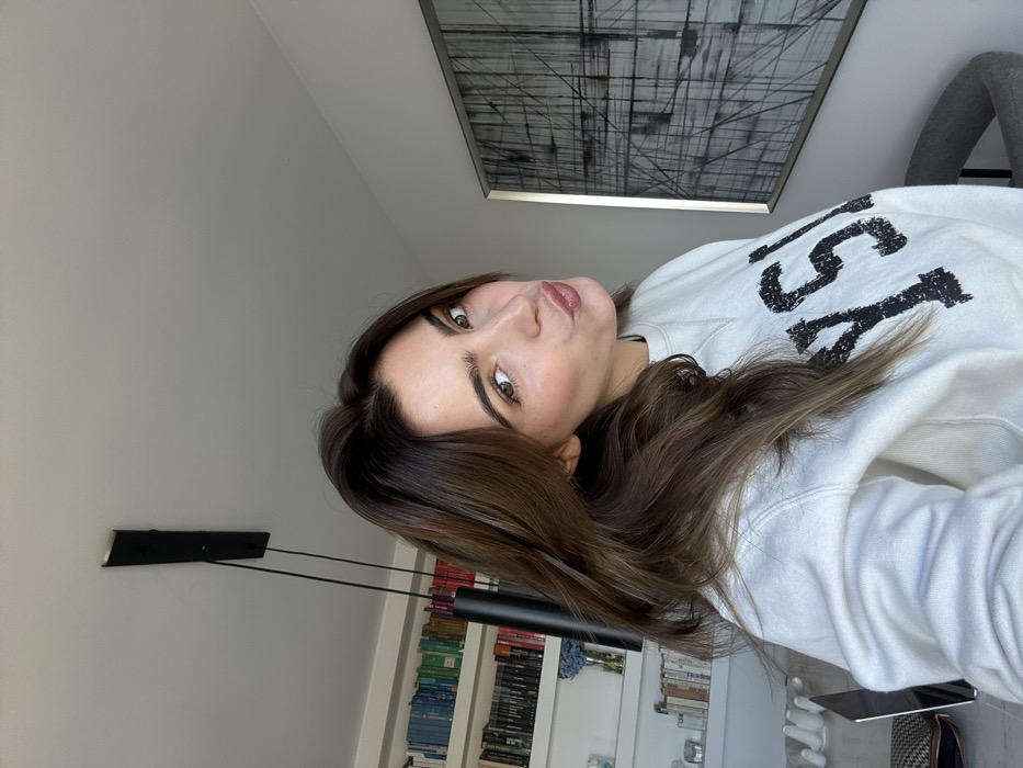 The image displays an indoor scene, located in the city of Loures, Portugal. A single female individual is centrally positioned, facing the viewer with her head tilted slightly to the left and her lips pursed. She has medium-brown hair, styled with waves, and is wearing a light-colored, possibly off-white, crewneck sweatshirt with dark, distressed lettering, partially visible as "YS", on the front. The background reveals a brightly lit room with white walls. To the left, multiple open shelves are affixed to the wall, holding an organized collection of books, some arranged by color, and decorative objects including a light blue vase containing flowers. A black linear light fixture with two cylindrical pendants hangs from the ceiling in the upper left quadrant. A silver electronic device, possibly a laptop, and a patterned bag are partially visible on a surface below the shelves. To the right, a large, rectangular framed artwork with black abstract linear patterns on a light background is mounted on the wall. A grey upholstered chair is partially visible in the lower right corner.