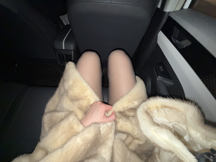 Inside a vehicle, a person's legs are visible, clad in sheer tights. A light-colored fur coat is draped over the legs, with one hand holding a section of the coat. The interior of the car is primarily dark, with the seats and panels appearing black or dark gray. A white accent panel is visible on the door. The center console is partially visible in the background.
