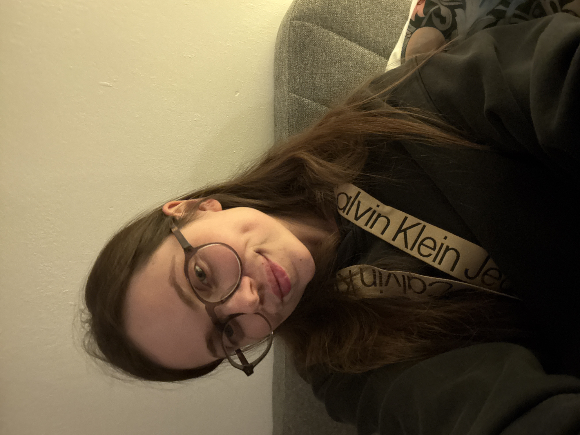 A woman with long brown hair and round glasses is lying on a gray couch, wearing a black Calvin Klein sweatshirt. She is positioned against a light beige wall. The location is not discernible from the image.