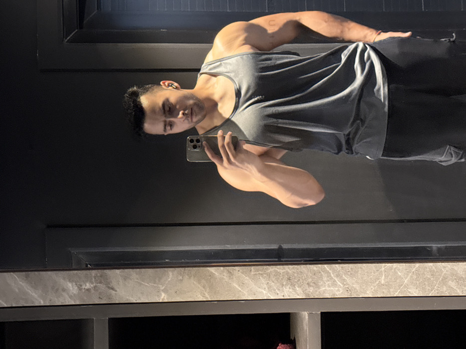 An adult male, exhibiting a muscular physique, is depicted taking a mirror selfie indoors in Kolkata, India. He appears to be of South Asian descent, with short dark hair and a light stubble. He is wearing a dark grey sleeveless tank top and dark athletic pants. A white wireless earbud is visible in his right ear. His right hand holds a smartphone, likely an iPhone model with three rear cameras, angled to capture his reflection in a full-length mirror. His gaze is directed downwards and to his right. His left hand is positioned within his pants pocket. The immediate environment consists of a reflective surface, indicating a mirror, behind which is a dark, possibly charcoal-colored, wall or paneling. To the left of the subject, a vertical structure with a grey, veined marble-like texture is visible, potentially a column or part of an architectural feature. Below this, a dark, recessed shelf contains a folded red textile item. The overall setting suggests a modern indoor space, such as a gym, fitness center, or a well-appointed private room, consistent with contemporary urban interiors found in a city like Kolkata. No external city landmarks are visible to pinpoint a more specific location within Kolkata.