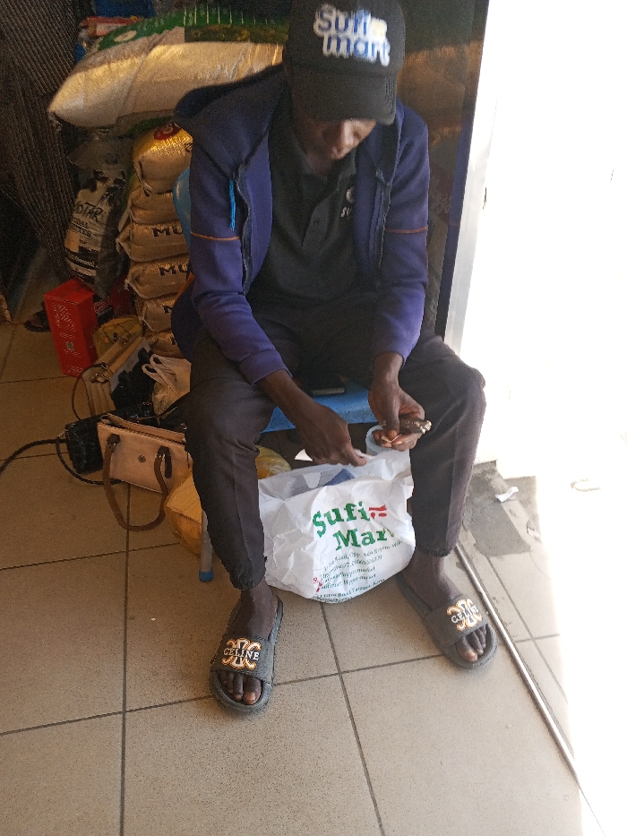 A male individual is seated on a blue plastic stool inside what appears to be a retail establishment in Tarauni, Nigeria