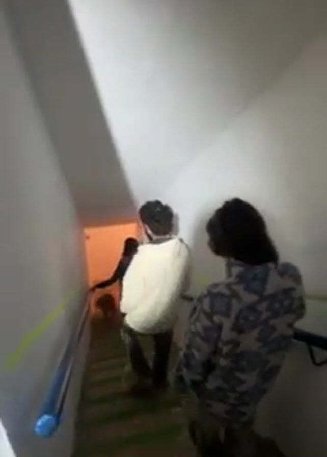 Three people are walking down a narrow, concrete stairwell. The walls are white and a blue handrail runs down the left side. The stairs themselves appear to be concrete with faded green paint. Light is coming from the bottom of the stairs, illuminating the figures ahead. The person in the front is wearing a white hoodie and light-colored pants. The person behind them is wearing a patterned jacket.