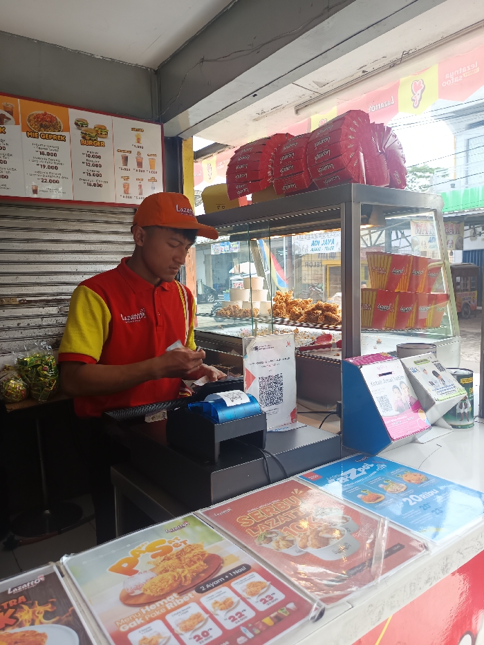 - "The image depicts a young adult male employee working at a Lazatto fried chicken stall in Maleber, Indonesia, during daylight hours" by FM-WRTkH2, licensed under CC BY 4.0