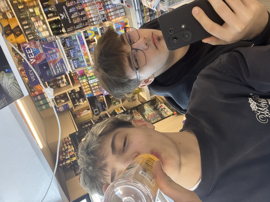 The image captures two young males inside a retail establishment, likely a convenience store or market