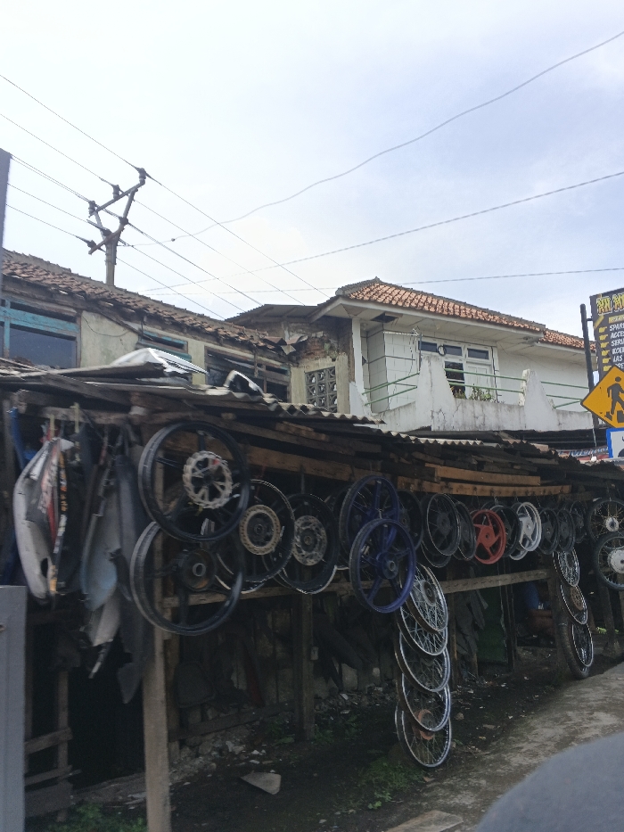 - "A makeshift outdoor shop displays used motorcycle parts, mainly wheels, hanging from a wooden structure with a corrugated metal roof" by FM-Ez2gs2, licensed under CC BY 4.0