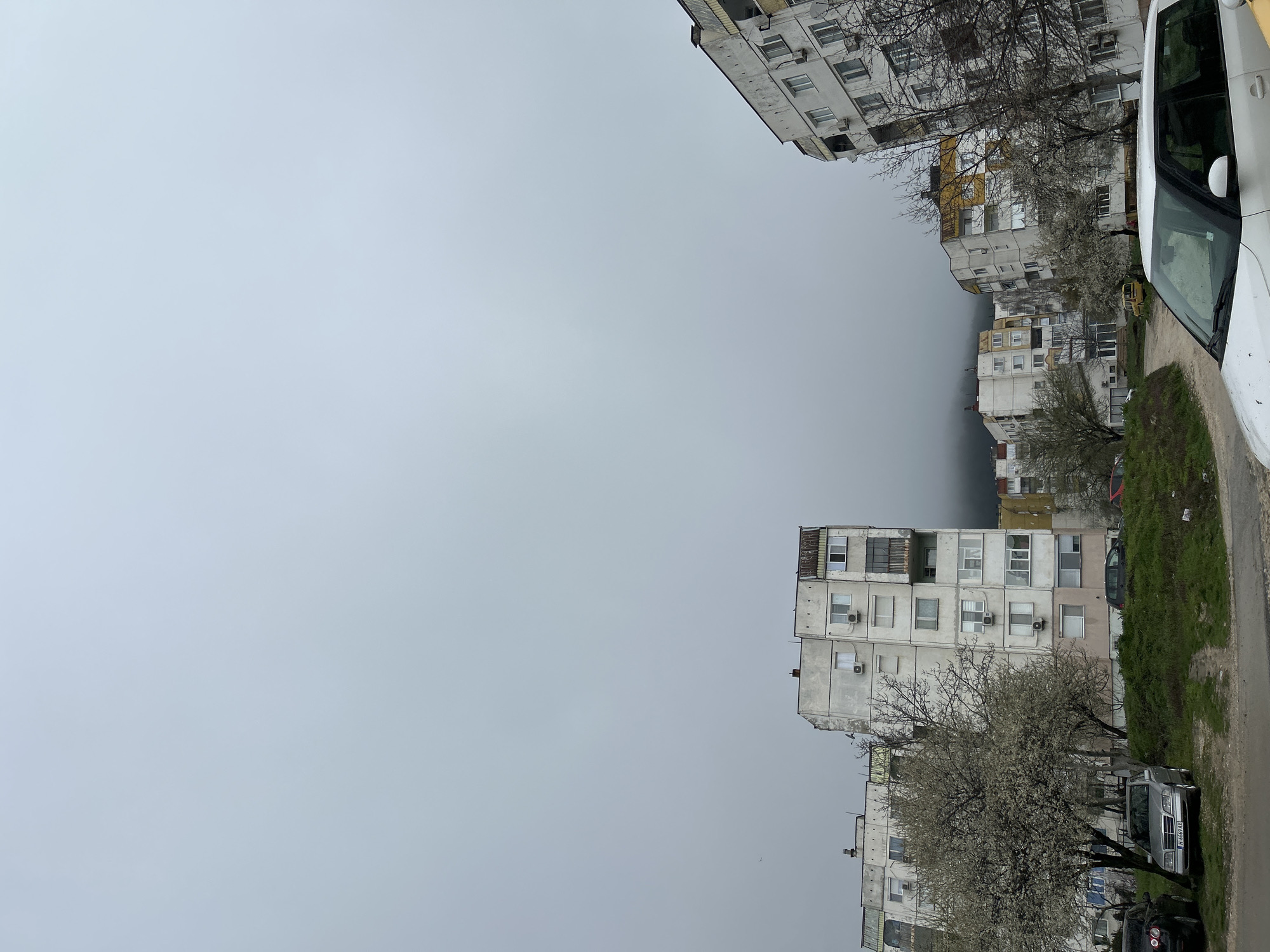 street scene in Shumen, Bulgaria, characterized by overcast skies. Several apartment buildings, typical of Soviet-era construction, are visible. The buildings are multi-story, with repetitive window patterns and some balconies. Some have visible air conditioning units mounted on the exterior. Deciduous trees, possibly in early spring bloom, are interspersed along the street. Several cars are parked along the roadside, including what appears to be a white van. The street is paved, with grassy verges on either side. The overall impression is of a residential area on a cloudy day.