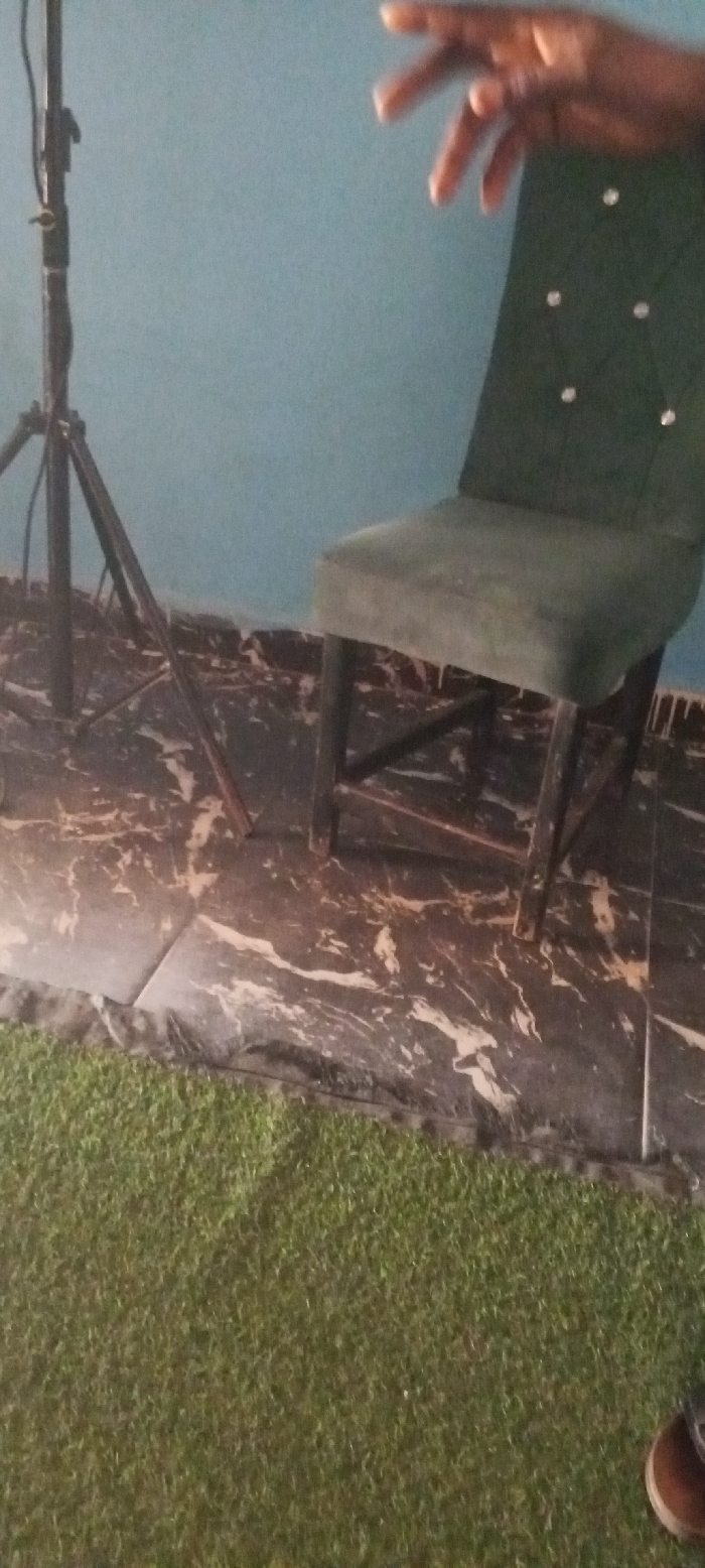 **Location:** Unknown, Unknown. **Scene Description:** The scene depicts an indoor or semi-enclosed environment. The upper portion of the image is dominated by a solid, light blue wall. The floor is divided into two distinct sections: a dark, highly polished tiled area with prominent white and light brown marbling patterns, and an adjacent section of artificial green turf. In the mid-left, a black metal tripod stand is positioned on the marbled floor, with its legs extended and a vertical pole extending upwards. In the mid-right, a high-backed, armless chair with dark green velvet upholstery stands on the marbled floor. The chair's back is tufted with several light-colored, possibly decorative, buttons arranged in a diamond pattern. Its legs appear dark. A human right hand, exhibiting a medium-dark skin tone, is visible in the upper right quadrant of the image. The hand is open, with fingers slightly splayed, appearing to be in a gestural or reaching posture above and slightly to the left of the chair. A partial view of a round, brown object is present on the artificial turf in the lower right corner. No direct interaction between the hand and the visible objects is clearly depicted.