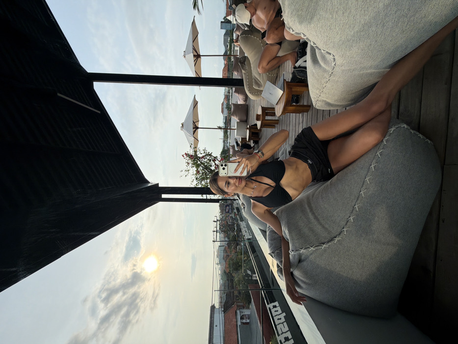 The image depicts a rooftop lounge located in Canggu, Indonesia, during the late afternoon. In the foreground, a female individual is seated on a grey beanbag chair, wearing a black halter-neck top and black shorts with an "ALO" logo visible on the waistband. She holds a white-cased smartphone in her left hand, pointed towards herself, and is looking into the lens with a faint smile, actively taking a selfie. Her right arm rests on the beanbag, and her legs are extended. To the right, in the mid-ground, a male individual is seated on a light brown beanbag. He is shirtless, wearing a white baseball cap backward, and is focused on a smartphone held in his hands. An open silver laptop rests on a small, square wooden table positioned beside him. The lounge area is furnished with multiple grey and light brown beanbag chairs and small wooden tables, arranged on a wooden-planked deck. Two large, light-colored patio umbrellas are open in the background, above additional seating. A dark, angled roof structure with supporting pillars partially covers the immediate lounge area. A glass railing, reflecting partial white text resembling "Rooftop" or "Topself," separates the lounge from the exterior view. Beyond the railing, a low-rise cityscape of Canggu is visible, featuring buildings with tiled roofs and scattered greenery. The sky shows a bright, low sun on the left, consistent with late afternoon conditions, with scattered clouds overhead.