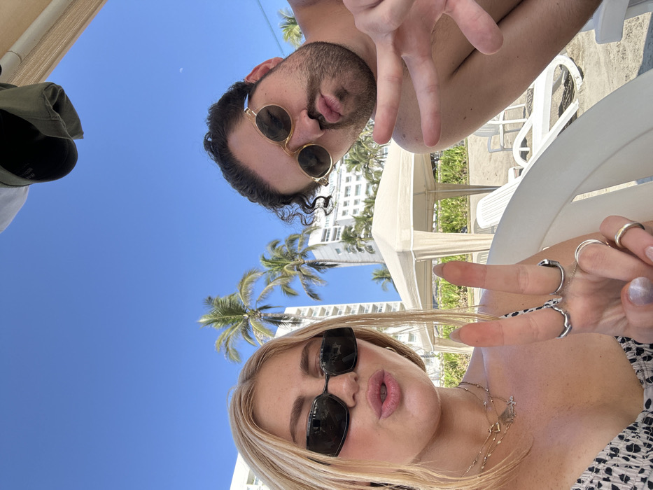 From a low-angle perspective, a man and a woman pose for a selfie, both flashing a peace sign. The man has dark hair, a beard, and round sunglasses. The woman has blonde hair and wears rectangular sunglasses, rings, and layered necklaces. Behind them, palm trees and a building rise against a clear blue sky. Portions of a white lounge chair and a beige-colored gazebo are also visible.