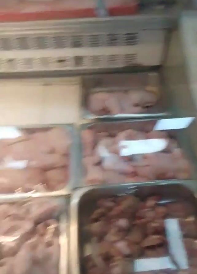 display case filled with various raw meats. Different cuts of meat are visible in silver trays, some wrapped in plastic. The case appears to be in a store, possibly a grocery or butcher shop. The camera pans slightly across the display. At the end of the video, a person's lower legs and black shoes are briefly visible.