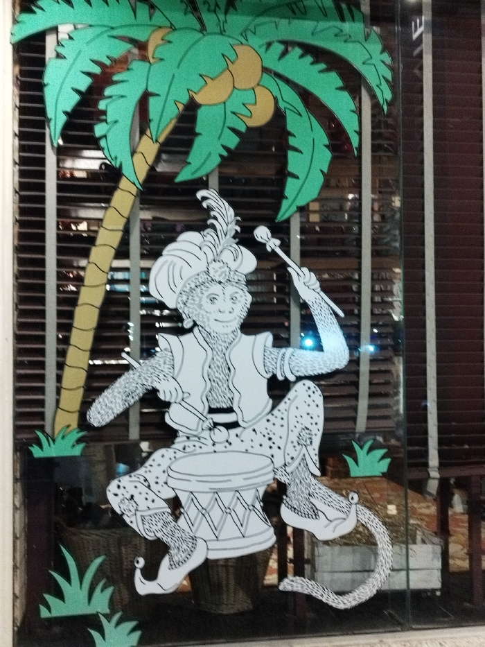 A whimsical window painting features a palm tree with coconuts above a dressed monkey playing a drum