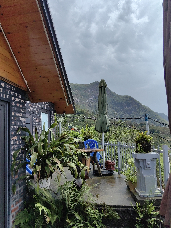 The image displays an outdoor patio area in the mountainous region of Tả Van, Vietnam, under an overcast sky. To the left, a building facade features dark brickwork and a wooden overhang or eaves. Below the eaves, a white conduit is affixed to the wall. Two dark-framed windows or doors are partially visible on the building's exterior. Lush green plants, including a large potted plant resembling a dracaena or sansevieria and various ferns, are positioned along the base of the building and on the concrete patio surface. The concrete patio, which appears slightly damp, extends into the midground. On this patio, a small rustic wooden table is present, accompanied by a single blue plastic chair. A collapsed, green market umbrella stands upright near the table. A white metal railing acts as a barrier along the edge of the patio, overlooking a steep, heavily vegetated slope. Further along the railing, a grey concrete pedestal supports a planter containing more foliage. Multiple black wires traverse the scene above the railing, connected to a pale blue-capped pole. A reddish-brown ceramic pot sits on the patio floor near the table. In the background, steep, green mountains covered in dense vegetation rise under an expansive, light grey, overcast sky. Distant agricultural terraces are discernible on some slopes. Small, sparsely distributed structures are visible on the distant hillsides.