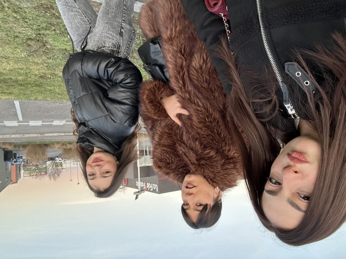 The image depicts three females positioned outdoors in a commercial district of Vendenheim, France, specifically in front of a "La Foir'Fouille" retail store located at 12 Rue du Commerce, 67550 Vendenheim. The time of day is late afternoon or early evening, evidenced by the light blue and pink hues of the sky. From left to right: 1. A female with long, dark brown hair wears a black zippered jacket. She is actively posing with her lips pursed towards the camera, which she appears to be holding. A silver earring is visible, and a dark red quilted shoulder bag with a gold chain strap is present on her left side. 2. A second female, with dark brown hair styled with bangs, wears a prominent long brown faux fur coat. She looks towards the camera with a subtle smile, with her right hand obscured by the coat. A black shoulder bag with a chain strap hangs on her left side. 3. A third female, with long dark brown hair, wears a black puffer jacket and light grey acid-wash jeans. She is smiling directly at the camera and appears to be in motion, stepping forward. The background features the large, black-facaded "La Foir'Fouille" building with red signage. In front of the building is a paved parking lot with white ground markings, bordered by patches of grass and sparse, dormant vegetation. Several parked vehicles and additional commercial buildings are visible in the distance under a clear sky.