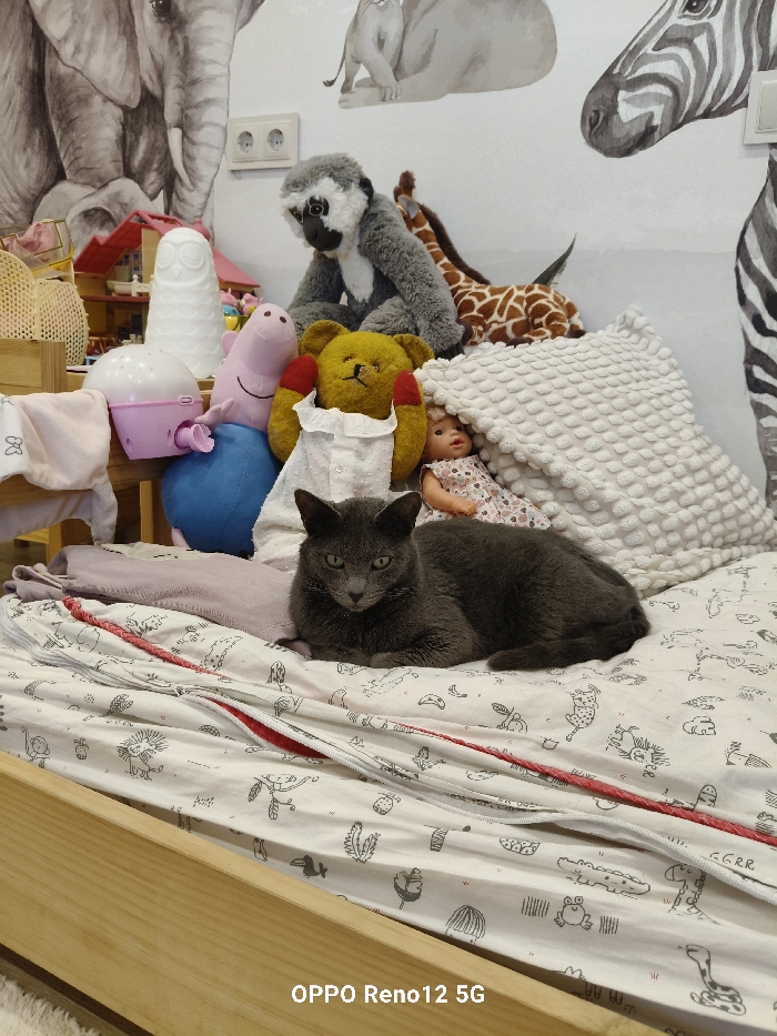 - "An indoor scene, likely a child's bedroom or play area, features a grey adult cat resting on a bed" by FM-VDlEK2, licensed under CC BY 4.0