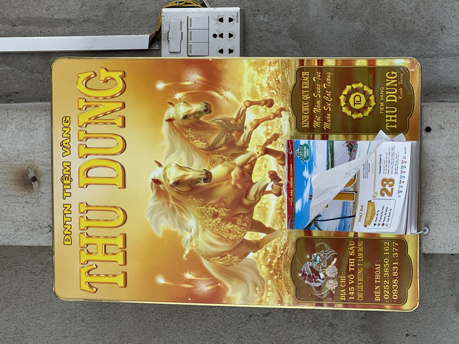 A sign for "Thu Dung" gold jewelry store, displaying stylized gold horses on a golden background, is mounted on a wall near an electrical outlet