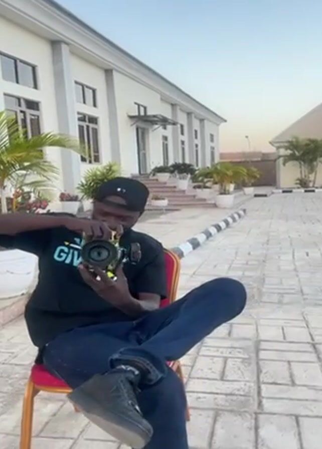 The video depicts a man sitting on a red chair in an outdoor setting. He is wearing a black t-shirt with the words "NEVER GIVE UP", blue jeans, and black sneakers. He also has on a black baseball cap. He is holding a camera up to his eye and appears to be taking a photo. Behind him is a large, white building with several windows and columns. There are also potted plants and palm trees in the background. The ground is paved with patterned concrete bricks. The sky is light blue, suggesting it is either early morning or late afternoon.