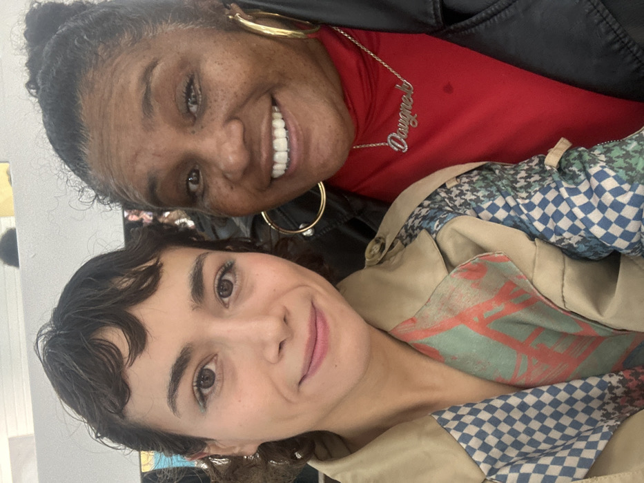 Two women pose closely, one above the other, smiling. The upper woman wears large gold hoop earrings, a red top, and a black jacket. A gold nameplate necklace is visible. The lower woman has brown hair and a light-colored coat lined with a blue and white checkered pattern. A scarf with orange and green patterns peeks from the coat. The image is slightly tilted.